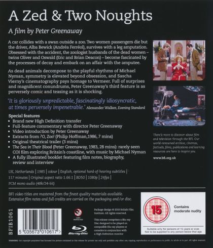Bármilyen perverz, kötekedően komikus, amilyen sokkoló, az A Zed and Two Noughts tele van meglepetésekkel. Egyszerre önreflexív intellektuális rejtvény és gonoszul sötét vígjáték, a film Peter Greenaway két évtizedes együttműködésének kezdetét jelentette a Marienbad operatőrrel, Sacha Viernyvel, a Last Year-vel