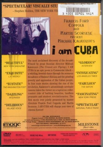 An unabashed exercise in cinema stylistics, I Am Cuba is pro-Castro/anti-Batista rhetoric dressed up in the finest clothes. The film's four dramatic stories take place in the final days of the Batista regime; the first two illustrate the ills that led to the revolution, the third and fourth the call to arms which cut across social and economic lines.