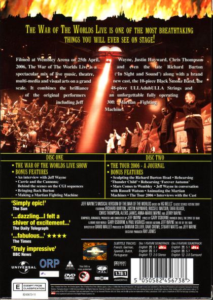 In 1978 Jeff Wayne composed and produced one of the most groundbreaking and best-selling musical works of all time. In 2006, after much anticipation, Jeff Wayne's Musical Version of The War of The Worlds was brought to the stage for the first time, playing to sold-out arenas. This version filmed at Wembley Arena (UK) on 25th April 2006.