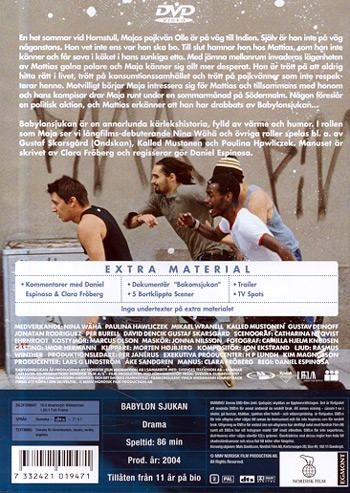 Elsőfilmesek rendkívül friss szellemű, eredeti, jó ritmusú játékfilmje a "Babylon kór". A mai huszonévesek filmje huszonévesekről. A város, ahol élnek Stockholm. Mint mindenütt a világon, a metropoliszokban ugyanazok a problémák, a szerelem, a drog és a lé, a bandák, nincs lóvé, hová menjünk betépni? És így tovább. Maja 20 éves, hajléktalan, s ráadásul nagyszerelme Olle is elhagyja a várost, s Indiába utazik. Maja teljesen magára marad a vakációra, ki kell költöznie a közös albérletből, de Olle ráhagy egy telefonszámot, ahol meghúzhatja magát. Maja megkeresi az új kéglit, ahol Mattias él barátaival. A lakás kicsi, épp hogy van egy-egy zuga mindenkinek. Maja beköltözik a konyhába, egy sarokba, amely nem éppen nyugodt hely, s az izgalmas, helyes, lány egyik-napról a másikra megváltoztatja a fiúk életét, de a fiúk is az övét.