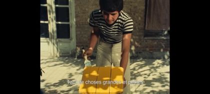 old brothers learning how to improve their surroundings by painting an old door. With the narrator giving step-by-step instructions, the boys go through the processes of sanding, applying primer, and mixing different types of paint. Whatever its educational value, the film’s quiet enthusiasm for its subject also reflects Kiarostami’s own interest in woodworking.