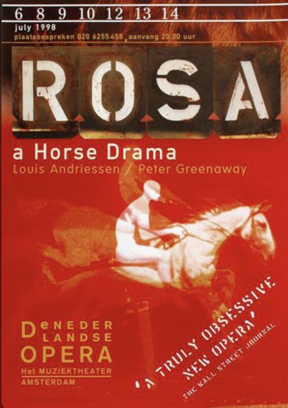 "Rosa", with a libretto by Peter Greenaway and score by Louis Andriessen, is the first in a projected series of 10 operas, each dealing with the death of a famous composer - some real, others fictional. "Rosa" falls into the latter category; it tells the story of Juan Manuel de Rosa, a Brazilian who went to study music in America but spent most of his time in the cinema instead, becoming particularly entranced by Westerns. Now 32 years old and residing in an abandoned Uruguayan slaughterhouse, Rosa has become one of Hollywood's foremost composers, specialising in Westerns. He also has a beautiful 19-year-old fiancee, Esmeralda, but he pays her little heed, instead lavishing his attentions on a black mare named Bola. One day, a group of men attired as cowboys arrive at the abattoir and kill both Rosa and Bola; an investigation is conducted, with particular suspicion!