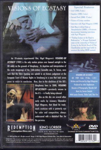 A Visions of Ecstasy a 16. századi karmelita apáca, Szent Teréz erotikus képzeteit ábrázolja, aki gyertyákkal és keresztekkel körülvéve arról fantáziál, hogy a megfeszített Krisztussal szeretkezik.