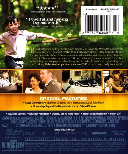 Set during World War II, a story seen through the innocent eyes of Bruno, the eight-year-old son of the commandant at a concentration camp, whose forbidden friendship with a Jewish boy on the other side of the camp fence has startling and unexpected consequences.