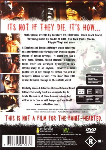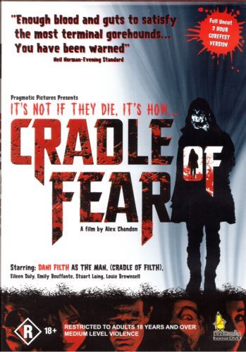 A gruesome homage to the cult Amicus anthology Asylum, Cradle of Fear unfolds four screamplays all linked by the unspeakable need of an incarcerated child killer to wreak vengeance on those responsible for his imprisonment. Helped by deranged angel Dani Filth, who leaves a trail of charnel house death in his crimson wake, the cannibal convict forces two Goth vamps to endure a one night stand from hell, two tough female robbers to see through each other, an obscenely rich coke-head to chop up more than a few lines and an internet surfer to descend into madness when he uncovers the ultimate web depravity.