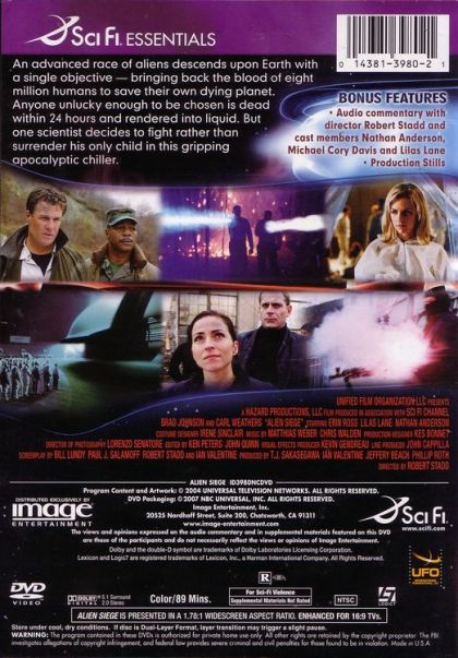 Alien Siege is a 2005 Sci-Fi Channel Original Movie about an alien race that comes to Earth seeking a cure to a deadly virus, for which the antidote is human blood.