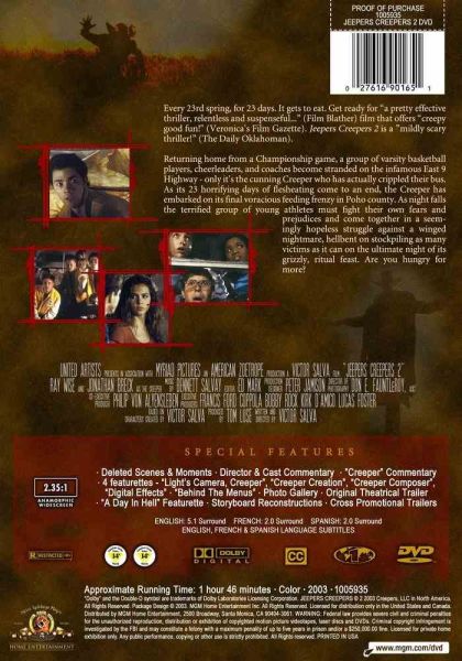 After 23 horrifying days of gorging on human flesh, an ancient creature known as the Creeper embarks on a final voracious feeding frenzy, terrorizing a group of varsity basketball players, cheerleaders and coaches stranded on a remote highway when their bus breaks down. The terrified group is forced to come together and do battle against the winged creature hell-bent on completing its grizzly ritual.