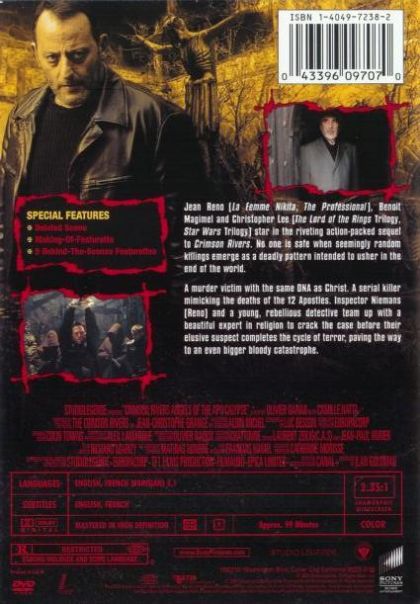 Jean Reno, Benoit Magimel and Christopher Lee (The Lord of the Rings Trilogy, Star Wars Trilogy) star in the riveting action-packed sequel to Crimson Rivers. No one is safe when seemingly random killings emerge as a deadly pattern intended to usher in the end of the world. A murder victim with the same DNA as Christ. A serial killer mimicking the deaths of the 12 Apostles. Inspector Niemans (Reno) and a young, rebellious detective team up with a beautiful expert in religion to crack the case before their elusive suspect completes the cycle of terror, paving the way to an even bigger bloody catastrophe.