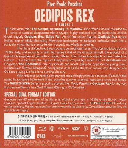 Sajátos módon vitte filmvászonra Szophoklész drámáját az olasz film fenegyereke, Pier Paolo Pasolini. A cselekmény két szálon fut. A XX. században játszódó történet főhőse egy katonatiszt családjába születik, és apja már az első perctől féltékeny rá. Az ókori legendában pedig a kis Ödipuszt egy jóslat miatt halálra szánják, távol családjától nevelődik fel.