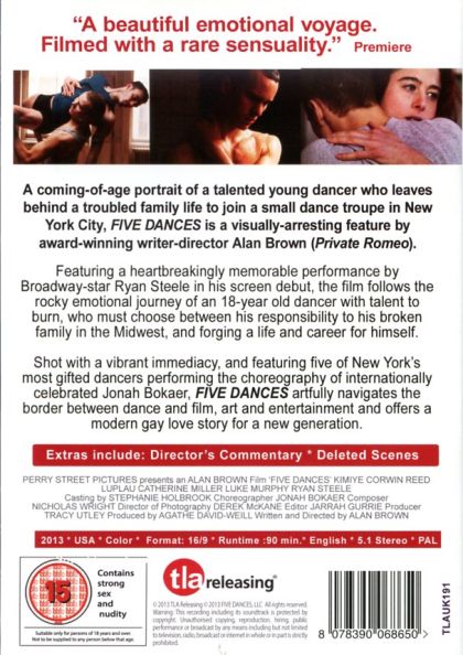 FIVE DANCES, written and directed by Alan Brown, is a creatively adventurous narrative feature film set in the New York 'downtown' modern dance world. The story follows the rocky emotional journey of an 18-year old dancer (the amazing Ryan Steele) with talent to burn, who must choose between his responsibility to his broken family in the Midwest, and forging a life and career for himself. The film features five of New York's most gifted dancers acting on film for the very first time, and performing the choreography of internationally acclaimed choreographer Jonah Bokaer.