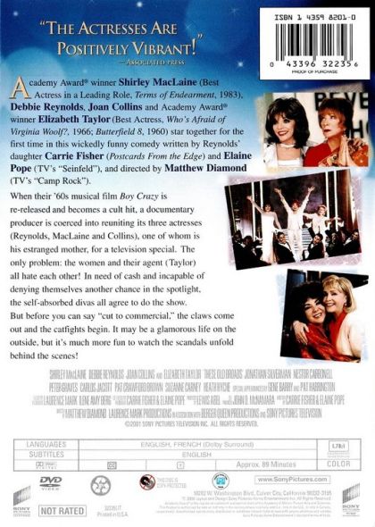 "These Old Broads" is a 2001 television film written by Carrie Fisher and starring her mother Debbie Reynolds, as well as Shirley MacLaine, Joan Collins, and Elizabeth Taylor in her final starring film role. Network television executive Gavin (Nestor Carbonell) hopes to reunite celebrated Hollywood stars Piper Grayson (Reynolds), Kate Westbourne (MacLaine), and Addie Holden (Collins) in a TV special after their 1960s movie musical "Boy Crazy" is re-released in the 1990s. Though the three women share the same agent, Beryl Mason (Taylor), Gavin's seemingly insurmountable obstacle is that they all cannot stand each other.