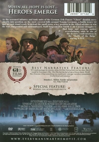 No one in high command believed that German forces would attack in the sub zero temperatures and near blizzard conditions. As the pre-dawn attack comes, with communications down Sgt. Smith is left with no choice but to make his way through enemy fire, unarmed and wounded, into town and warn of the coming attack. Based on actual accounts "Everyman's War" explores the heroic events of this decorated veterans courage and the struggle between duty and desire. Between the prospect of the life and love, Dorine that waits at home and the harsh realities of war which marks the pivotal epoch in his life as he discovers that the loss of hope can be worse than the loss of life. One man's courage... One man's hope...Everyman's War.