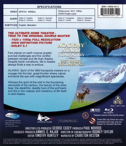 Alaska... Here, in this vast and spectacularly beautiful land teeming with abundant wildlife, discover the "Spirit of the Wild." Experience it in the explosive calving of glaciers, the celestial fires of the Aurora Borealis. Witness it in the thundering stampede of caribou, the beauty of the polar bear and the stealthful, deadly hunt of the wolf pack.