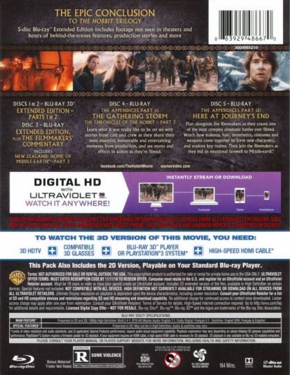 Zsákos Bilbo és barátai visszahódították otthonukat Smaugtól. A dühös sárkány bosszúból rátámad Tóvárosra. A visszaszerzett kincsektől megrészegült Tölgypajzsos Thorin elárulja a barátait. Eközben Szauron szörnyű tervet forral: orkok seregét indítja útnak a Magányos Hegy ellen. A törpék, tündék és az emberek hamarosan választás elé kerülnek: összefognak vagy elpusztulnak. Bilbo az öt sereg gigászi csatája közepén találja magát, ahol Középfölde sorsa forog kockán. A Hobbit-trilógia befejező része.