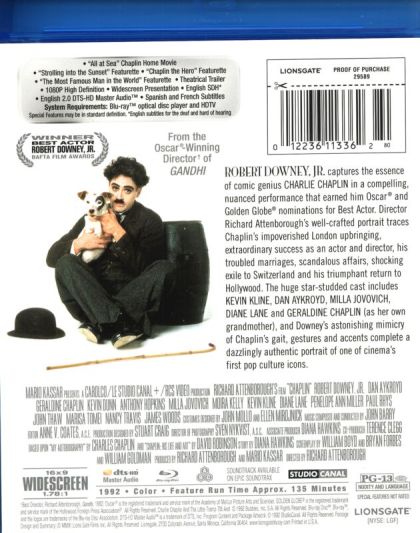 Richard Attenborough, az életrajzi tablók nagymestere, ezúttal a filmtörténet talán legnagyobb figuráját tűzte kameravégre. Charlie Chaplin, századunk zseniális nevettetője kalandregénybe illő életet élt. A nagy komikus pályáját feldolgozó film persze vígjátéki elemekben sem szűkölködik, de nem hiányoznak a tragikus sorsfordulók, sőt a krimibe illő hajszák sem. A címszerepben Robert Downey Jr., parádés alakítása látható, de méltó társa Dan Aykroyd, Anthony Hopkins és Geraldine Chaplin is.