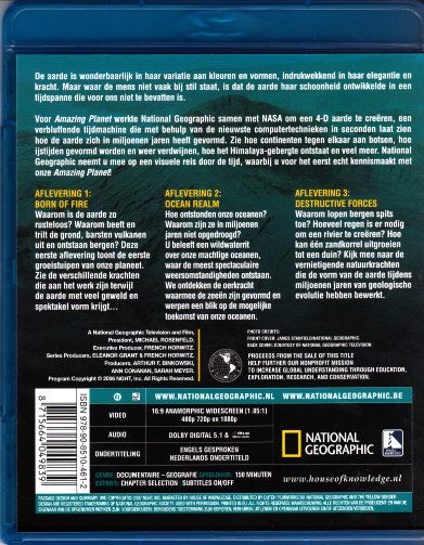 De aarde is wonderbaarlijk in haar variatie aan kleuren en vormen, indrukwekkend in haar elegantie en kracht. Maar waar de mens niet vaak bij stil staat, is dat de aarde haar schoonheid ontwikkelde in een tijdspanne die voor ons niet te bevatten is. Voor Amazing Planet werkte National Geographic samen met NA SA om een 4-D aarde te creëren, een verbluffende tijdmachine die met behulp van de nieuwste computertechnieken in seconden laat zien hoe de aarde zich in miljoenen jaren heeft gevormd. Zie hoe continenten tegen elkaar aan botsen, hoe ijstijden gevormd worden en weer verdwijnen, hoe het Himalaya-gebergte ontstaat en veel meer. National Geographic neemt u mee op een visuele reis door de tijd, waarbij u voor het eerst echt kennismaakt met onze Amazing Planet!