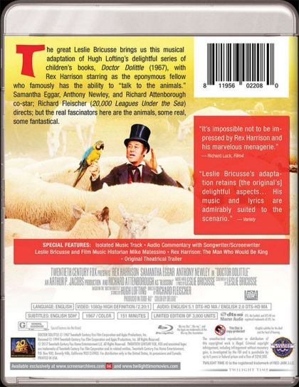 Get ready for the wildest adventure of a lifetime in the most ambitious production ever brought to film. Earning a 1967 Academy Award nomination for Best Picture, this dazzling fantasy turns both ordinary and exotic animals into talking, dancing and singing sensations! Rex Harrison is unforgettable in this inspiring adaptation of Hugh Lofting's classic stories.Step into the English country home of the good doctor as he performs remarkable treatments on the wildest variety of patients you could imagine. Discover his secret cures and watch with wide-eyed excitement as he and his four-legged, fine-feathered friends charm their way into your heart!