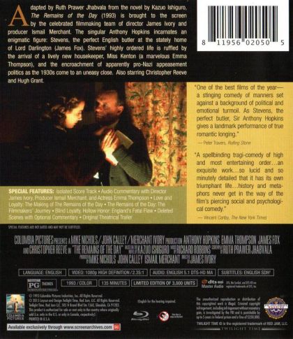 A rule bound head butler's world of manners and decorum in the household he maintains is tested by the arrival of a housekeeper who falls in love with him in post-WWI Britain. The possibility of romance and his master's cultivation of ties with the Nazi cause challenge his carefully maintained veneer of servitude.