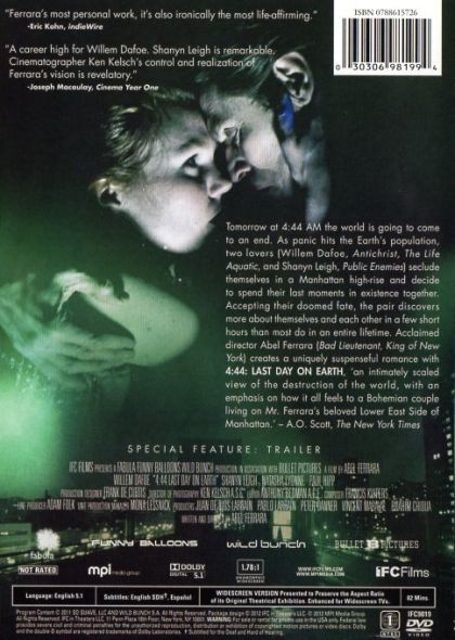 Abel Ferrara (Mocskos zsaru, Mária Magdolna) nem óriási büdzsével és számítógépes trükkökkel, hanem New York egyik bohém negyedének egyik lakásába befészkelve dolgozta fel a világvége témáját. A velencei filmfesztiválon bemutatott 4:44 Last Day on Earth című filmjében a tudósok kijelentik, hogy egy adott napon hajnali 4:44-kor eljön a világvége, mi pedig azt nézzük végig, hogyan tölti utolsó napját - sok szeretkezéssel és tévénézéssel - egy művészpár, akiket Willem Dafoe és Shanyn Leigh (utóbbi kisebb szerepeket játszott Ferrara több filmjében, köztük a Mária Magdolná-ban és a Go Go Tales-ben is) alakítanak. A kritikusok Velencében nem dicsérték halálra a filmet, de úgy tűnik, legalább a hangulata erős.