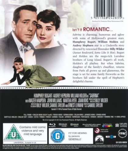 Linus and David Larrabee are the two sons of a very wealthy family. Linus is all work -- busily running the family corporate empire, he has no time for a wife and family. David is all play -- technically he is employed by the family business, but never shows up for work, spends all his time entertaining, and has been married and divorced three times. Meanwhile, Sabrina Fairchild is the young, shy, and awkward daughter of the household chauffeur, who has been infatuated with David all her life, but David hardly notices her -- "doesn't even know I exist" -- until she goes away to Paris for two years, and returns an elegant, sophisticated, beautiful woman. Suddenly, she finds that she has captured David's attention, but just as she does so, she finds herself falling in love with Linus, and she finds that Linus is also falling in love with her.