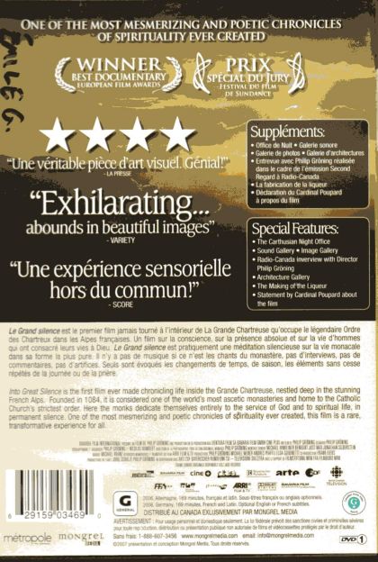 Into Great Silence (German: Die Große Stille) is a documentary film directed by Philip Gröning that was first released in 2005. It is an intimate portrayal of the everyday lives of Carthusian monks of the Grande Chartreuse, high in the French Alps (Chartreuse Mountains). The idea for the film was proposed to the monks in 1984, but the Carthusians said they wanted time to think about it. The Carthusians finally contacted Gröning 16 years later to say they were now willing to permit Gröning to shoot the movie, if he was still interested.