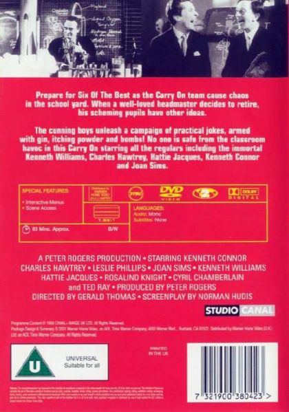 Prepare for Six of the Best as the Carry On team cause chaos in the school yard. When a well-loved headmaster decides to retire, his scheming pupils have other ideas. The cunning boys unleash a campaign of practical jokes, armed with gin, itching power and bombs! No one is safe from the classroom havoc in this Carry On starring all the regulars including the immortal Kenneth Williams, Charl