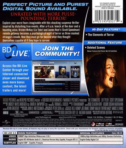 After a 4 a.m. knock at the door and haunting voices, Kristen McKay and James Hoyt’s remote getaway becomes a psychological night of terror as three masked strangers invade. Now they must go far beyond what they thought themselves capable of if they hope to survive.