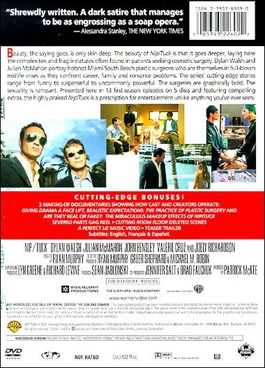 Beauty, the saying goes, is only skin deep. The beauty of Nip/Tuck is that it goes deeper, laying bare the complexities and fragile natures often found in patients seeking cosmetic surgery. Dylan Walsh and Julian McMahon portray hotshot Miami South Beach plastic surgeons who are themselves in full-blown midlife crises as they confront career, family and romance problems. The series' cutting-edge stories range from funny to suspenseful to uncommonly powerful. The surgeries are graphically bold. The sexuality is rampant.