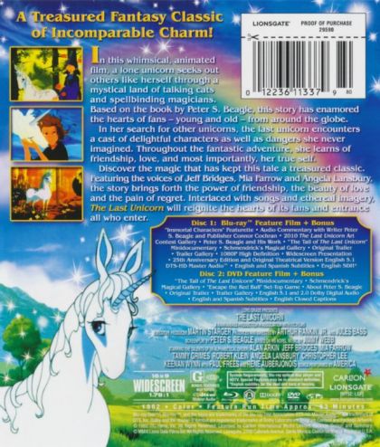 A unicorn learns from a riddle-speaking butterfly that she is supposedly the last of her kind, all the others having been herded away by the monstrous Red Bull. The unicorn sets out to discover the truth behind the butterfly's words. She is eventually joined on her quest by Schmendrick, a second-rate magician, and Molly Grue, a middle-aged woman who dreamed all her life of seeing a unicorn. Their journey leads them far from home, all the way to the castle of King Haggard.