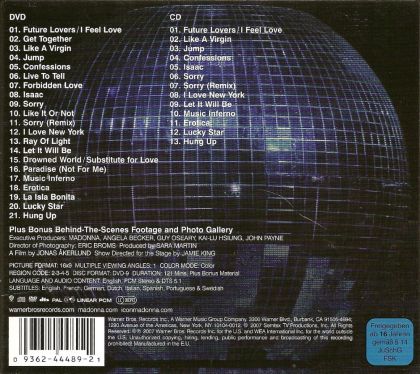 The Confessions Tour was the seventh world concert tour by American singer-songwriter Madonna to support her album Confessions on a Dance Floor. According to Billboard The tour grossed over US$194.7 million, becoming the highest grossing tour ever for a female artist. Madonna broke her own record in 2008, with her Sticky & Sweet Tour. 01. Future Lovers/I Feel Love 02. Get Together 03. Like A Virgin 04. Jump 05. Confessions 06. Live to Tell 07. Forbidden Love 08 .Isaac 09. Sorry 10 .Like It Or Not 11. Sorry (Remix) 12. I Love New York 13. Ray of Light 14. Let It Will Be 15. Drowned World/Substitute For Love 16. Paradise (Not For Me) 17. Music Inferno 18 .Erotica 19 .La Isla Bonita 20. Lucky Star 21. Hung Up