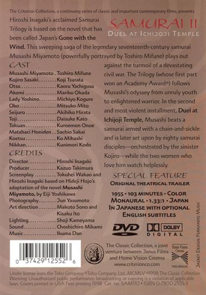 After years on the road establishing his reputation as Japan's greatest fencer, Takezo returns to Kyoto. Otsu waits for him, yet he has come not for her but to challenge the leader of the region's finest school of fencing. To prove his valor and skill, he walks deliberately into ambushes set up by the school's followers. While Otsu waits, Akemi also seeks him, expressing her desires directly. Meanwhile, Takezo is observed by Sasaki Kojiro, a brilliant young fighter, confident he can dethrone Takezo. After leaving Kyoto in triumph, Takezo declares his love for Otsu, but in a way that dishonors her and shames him. Once again, he leaves alone.