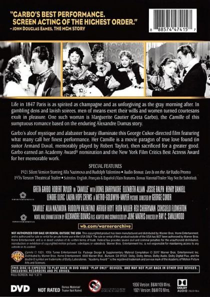 Life in 1847 Paris is as spirited as champagne and as unforgiving as the gray morning after. In gambling dens and lavish soirees, men of means exert their wills and women turned courtesans exult in pleasure. One such woman is Marguerite Gautier (Greta Garbo), the Camille of this sumptuous romance tale based on the enduring Alexandre Dumas story. Garbo's aloof mystique and alabaster beauty illuminate this George Cukor-directed film featuring what many call her finest performance. Her Camille is a movie paragon of true love found (in suitor Armand Duval, memorably played by Robert Taylor), then sacrificed for a greater good. Garbo earned an Academy Award nomination and the New York Film Critics Best Actress Award for her memorable work.