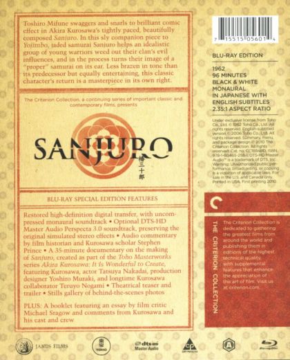 Toshiro Mifune swaggers and snarls to brilliant comic effect in Kurosawa's tightly paced, beautifully composed "Sanjuro." In this companion piece and sequel to "Yojimbo," jaded samurai Sanjuro helps an idealistic group of young warriors weed out their clan's evil influences, and in the process turns their image of a proper samurai on its ear.