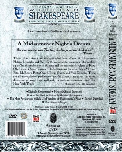 The second televised production of "A Midsummer Night's Dream" with Helen Mirren in the cast, although this time in a different role (Titania). In the 1968 production, which was released to movie theatres in Europe, but premiered in the U.S. on CBS-TV, Ms. Mirren played Hermia.