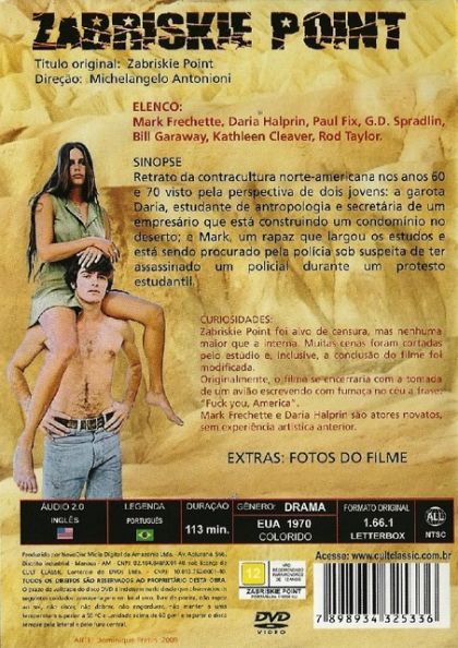 An epic portrait of late Sixties America, as seen through the portrayal of two of its children: anthropology student Daria (who's helping a property developer build a village in the Los Angeles desert) and dropout Mark (who's wanted by the authorities for allegedly killing a policeman during a student riot)...