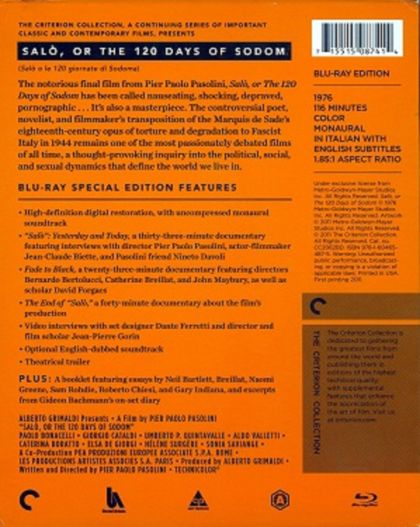 Az utolsó Pasolini-film De Sade márki nyomán: négy fasiszta egy villában a legváltozatosabb szexuális kínzásoknak veti alá a foglyokat. "A Saloval mindazokhoz fordulok, akik hozzám hasonlóan gyűlölik a Hatalmat, azért, amit az emberi testtel művel: dologgá aljasítja, s ezáltal az embert megfosztja a személyiségétől... Én különös hévvel gyűlölöm azt a hatalmat, amelytől most, 1975-ben szenvedek. Ez a hatalom olyan rettenetes eszközökkel manipulálja a testet, hogy még Hitlertől sincs mit irigyelnie:...új, elidegenített és hazug értékrendet hirdet, a fogyasztó társadalom értékeit. Ma az megy végbe éppen, amit Marx az élő, valódi, korábbi kultúrák megsemmisítésének nevezett..." (Pasolini)