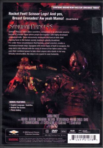 When 11 of her friends are raped and murdered, leaving the Samurai Princess (Aino Kishi) the only survivor, she becomes infused with her comrades' souls. Transformed into an android, she sets out to avenge their deaths. Dai Mizuno co-stars as the princess's human partner in this Kengo Kaji-directed gore fest that features breast grenades, detachable chainsaw limbs, deadly guitar riffs and more.