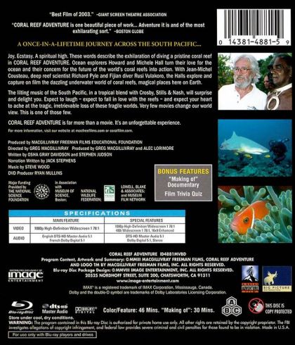 Coral Reef Adventure follows the real-life expedition of ocean explorers and underwater filmmakers Howard and Michele Hall. Using large-format cameras, the Halls guide us to the islands and sun-drenched waters of the South Pacific to document the health and beauty of coral reefs. Featuring songs written and recorded by Crosby, Stills & Nash.