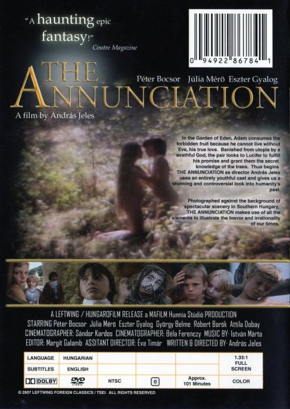The Annunciation (in Hungarian: Angyali üdvözlet) is a Hungarian film directed by András Jeles in 1984, based on The Tragedy of Man (1861) by Imre Madách. When Adam (Péter Bocsor) and Eve (Júlia Mérő), having succumbed to Lucifer's temptation, are cast out of the Garden of Eden, Adam holds Lucifer (Eszter Gyalog) to his promise, reminding him that "You said I would know everything!". So Lucifer grants Adam a dream of the world to come. And what a bizarre dream: Adam becomes Miltiades in Athens; a knight called Tancred in Byzantium; Kepler in Prague; Danton in revolutionary Paris; and a nameless suitor in Victorian London. Guided by a deceptively sweet but ultimately contemptuous Lucifer, Adam confronts an endless procession of the horror of the human story... rapists and concubines, betrayal and savagery, mindless cruelty and fanaticism.