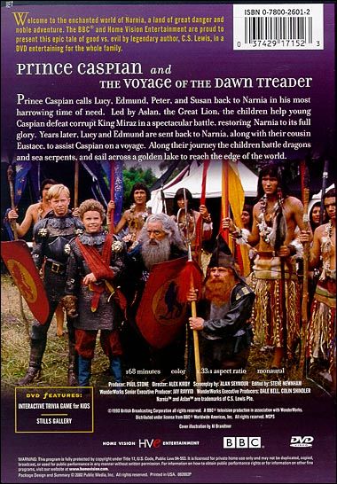 Based on "Prince Caspian" and "Voyage of the Dawn Treader". Prince Caspian escapes his uncles assassination attempt and call for the aid of four young children from our world. Then, they go for a voyage over the sea to find six missing noblemen and a way to Aslan's kingdom.