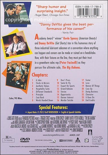 Three salesmen working for a firm that makes industrial lubricants are waiting in the company's "hospitality suite" at a manufacturers' convention for a "big kahuna" named Dick Fuller to show up, in hopes they can persuade him to place an order that could salvage the company's flagging sales.