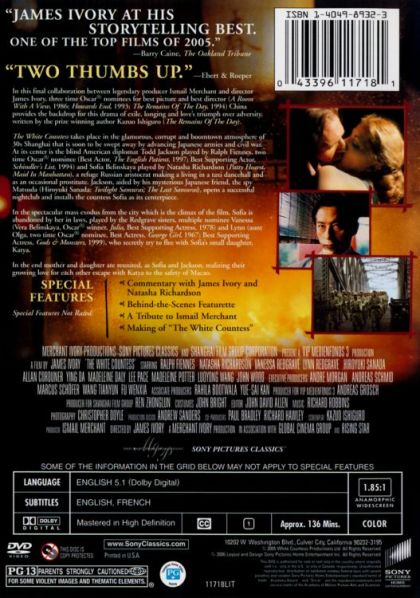 The last movie from the team of Ismail Merchant, James Ivory, and Kazuo Ishiguro. Set in 1930s Shanghai, "The White Countess" is both Sofia (Natasha Richardson), a fallen member of the Russian aristocracy, and a nightclub created by a blind American diplomat named Jackson (Ralph Fiennes), who asks Sofia to be the centerpiece of the world he wants to create.