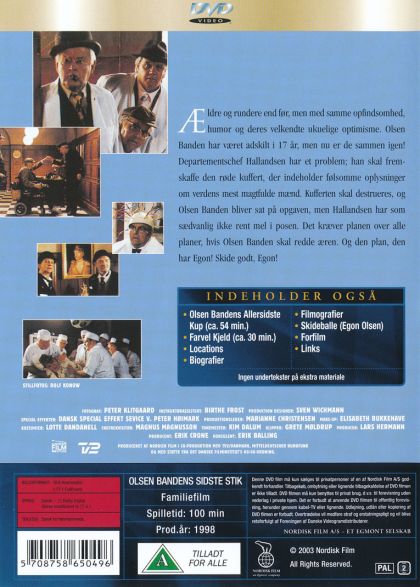 Az Olsen banda utolsó akciója Egon Olsen nagy visszatérése. Az Igazságügyi Minisztériumot lázban tartja, hogy a Wandenberg-dokumentumok újra előkerültek. A botrány elkerülhetetlen. Nemzetközi válság fenyeget. Mi több: ez világméretű katasztrófát jelenthet. A feladat egyszerű: meg kell semmisíteni a Wandenberg-dokumentumokat. Holm-Hansen miniszteri tanácsos személyesen fogja kiválasztani azokat a beosztottjait, akik részesei lehetnek e nemes ügynek. A legnagyobb nehézséget az jelenti, hogy Holm-Hansen csupa amatőrökkel van körbe véve. "Bezzeg az én időmben" - sóhajtozik. Húsz évvel ezelőtt bezzeg voltak még igazi szakemberek, óriási tehetségek. Hol van a híres Olsen banda?! Az igazi Trió! Ám Egon Olsen 18 éve az öregek otthonát lakja...