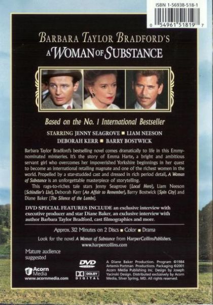 A Woman of Substance charts the life of Emma Harte, from kitchen maid at the beginning of the 20th Century, to respected business woman and Grandmother in the 1980's. From humble beginnings Emma Harte starts her business with a small shop, but over the next twenty years she expands her stores and invests in the growing textile industry in Leeds. By the time of World War 2, Emma is the head of a major retail and manufacturing empire, but she has struggled all her life to find love. After an illegitimate daughter and two marriages, she finally meets the love of her life, Paul McGill, but their affair is cut short by a tragic accident, leaving Emma with his daughter. In the 1980's Emma faces one of her biggest tests - her children's attempt to remove her as head of her company, but Emma is far from the senile old woman they think she is - she is determined to stop them at all costs. Written by Stacey Mitchell.