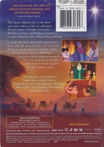 A brilliantly animated adaptation of the classic Christian story, 3 WISE MEN features the voices of Emilio Estevez, Martin Sheen, and Mexican television star Jaci Velasquez. Created by the same artists who animated FANTASIA 2000, HERCULES, and TARZAN, the family-friendly film artfully brings to life the journey of Melchior, Gaspar, and Balthazar--the Three Kings who traveled to baby Jesus' birthplace under the guidance of the Star of Bethlehem.