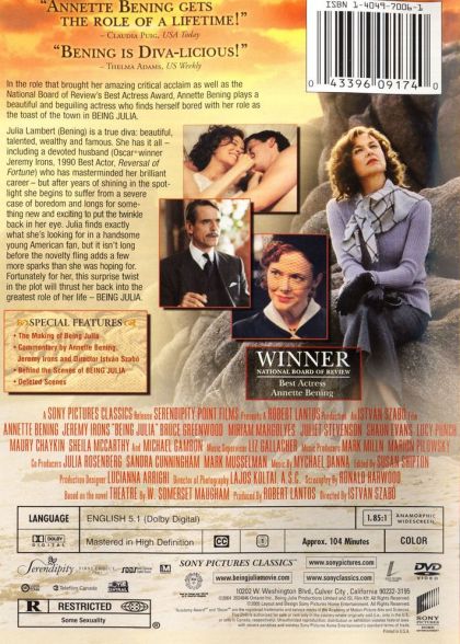 Julia Lambert is a true diva: beautiful, talented, weathly and famous. She has it all - including a devoted husband who has mastermined her brilliant career - but after years of shining in the spotlight she begins to suffer from a severe case of boredom and longs for something new and exciting to put the twinkle back in her eye. Julia finds exactly what she's looking for in a handsome young American fan, but it isn't long before the novelty fling adds a few more sparks than she was hoping for. Fortuately for her, this surprise twist in the plot will trust her back into the greatest role of her life.