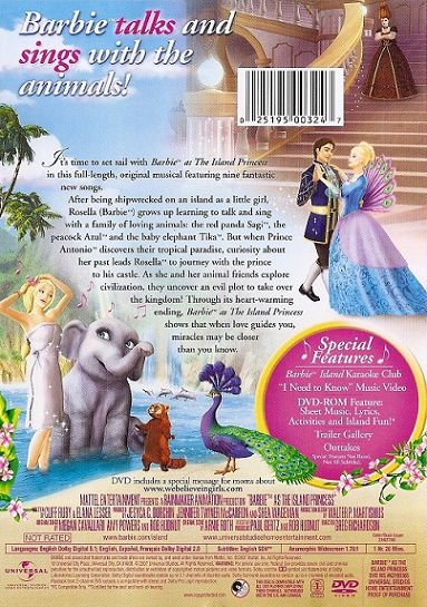 Barbie plays Rosella in this new musical film. Shipwrecked as a child, Rosella grows up on the island under the watchful eyes of her loving animal friends. The arrival of Prince Antonio leads Rosella and her furry pals to explore civilization and ultimately save the kingdom by uncovering a secret plot.