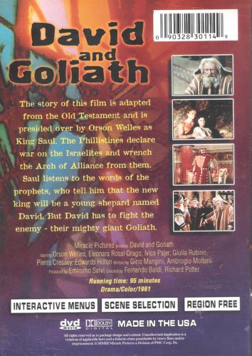 Orson Welles stars in this familiar Old Testament tale about the Philistines and the Israelites. When the Philistines attack, the Israelites are hopeless against the fierce giant Goliath and don't know what to do. King Saul takes the advice of the prophets and sends an adolescent shepherd, David, into battle to conquer the oversized Philistine. David is victorious and becomes the King of Israel.
