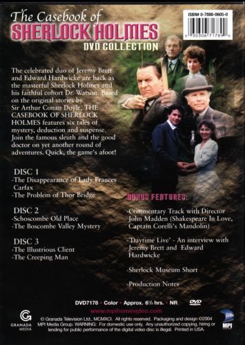 This listing takes in several series (all made by Granada, between 1984 and 1994) in which the late Jeremy Brett played the great detective :- The Adventures of Sherlock Holmes, The Return of Sherlock Holmes, The Casebook of Sherlock Holmes, The Memoirs of Sherlock Holmes, The Sign of Four, and The Hound of the Baskervilles. Granada Television had set themselves the task of filming every one of Sir Arthur Conan Doyle's Sherlock Holmes stories. A number of the mysteries were still waiting to be filmed at Jeremy Brett's death in 1995, but Granada decided not to continue without him.