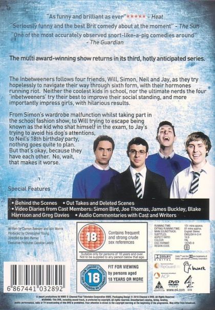 A series about four teenagers growing up in suburbia; a world of futile crushes, sibling brawls, getting drunk too quickly, fancying the girl next door, casting aspersions on your friend's sexuality and riding rollercoasters. Basically, they just want to get laid. Will's (Simon Bird) parents have just divorced and he has unwillingly had to move area and change schools. Previously enrolled at a private school, where he picked up some snobbish tendencies, Will now attends a comprehensive school and has had to make a new set of friends, Simon (Joe Thomas), Jay (James Buckley) and Neil (Blake Harrison), none of whom are that cool or credible. The Inbetweeners offers a comedic take on growing up in middle-class suburbia. A place where there are no teen pregnancies, no drugs, no knife fights and no guns. It's about a bunch of lads who get into real scrapes rather than real trouble.